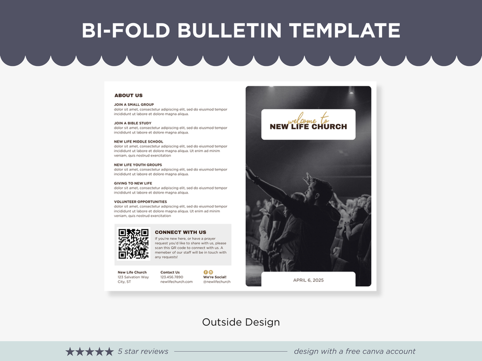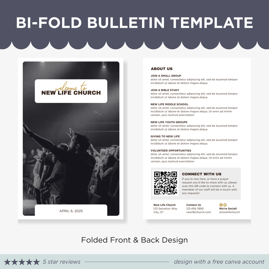 Church bulletins are a great way to keep your congregation and guests informed in a stylish and cohesive way. Use this template to keep your congregation in the know of prayer requests, upcoming events, church service order, and more. Pair this template with some of my other templates, such as preservice slides and instagram posts, to stay on brand with your church's colors & fonts.